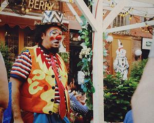 I was a fresh street photographer at the time, and even though I had been doing this for a while, it was my first time being in such a highly condensed area. I was letting shots fly left and right, and landed this one by utter surprise. When I got my photos back, I realized that the clown I had meant to photograph was not the only clown in the frame. As Bob Ross may say, it was a happy little accident.